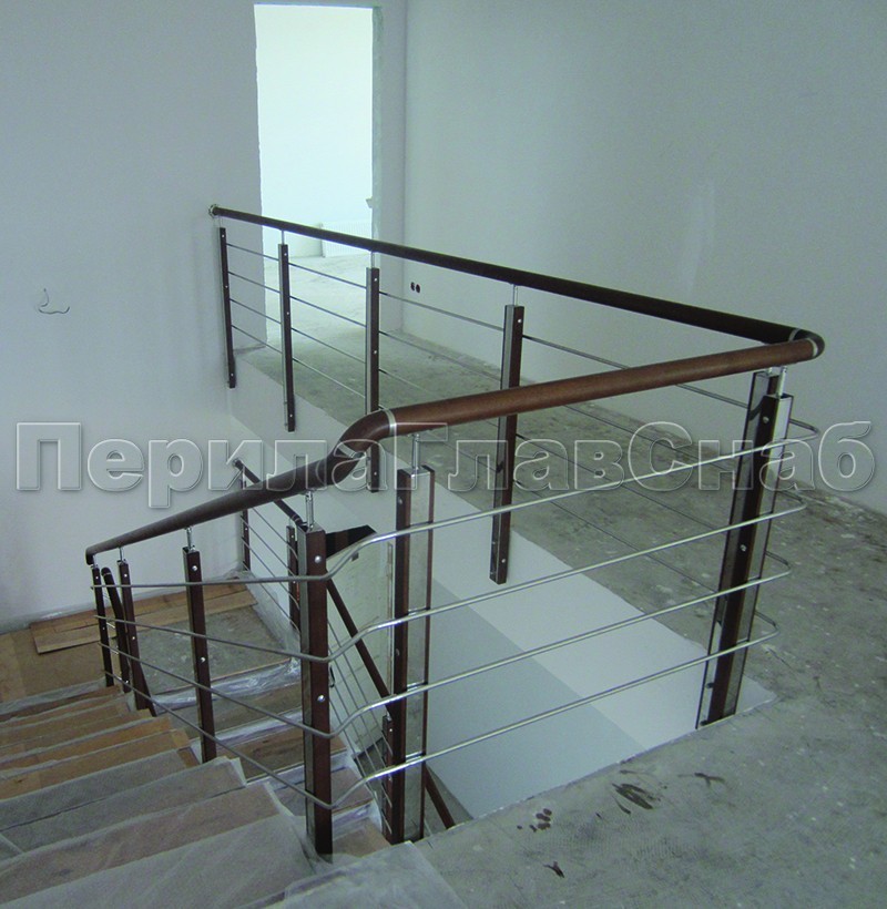 Нержавеющие ограждения без ригелей с круглым деревянным поручнем и стойками с деревянными вставками