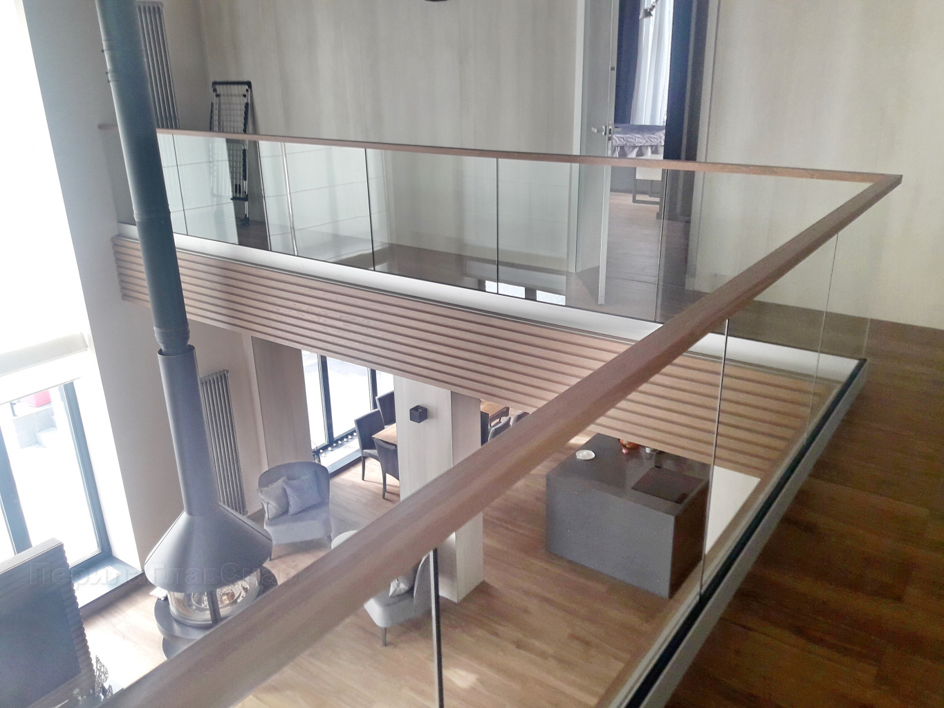 Ограждение с деревянным поручнем на точечном креплении на лестнице