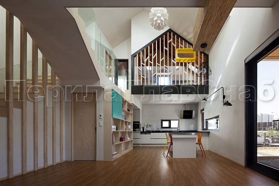 Ограждение с деревянным поручнем на точечном креплении на лестнице