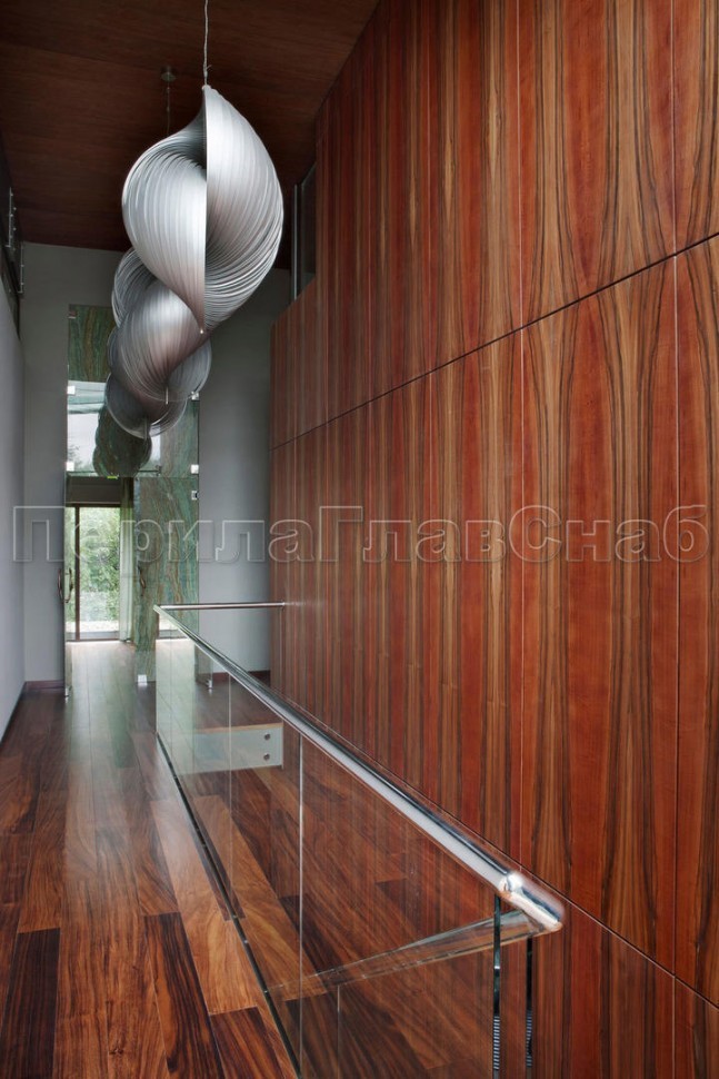 Ограждение с деревянным поручнем на выносе на точечном креплении на лестнице