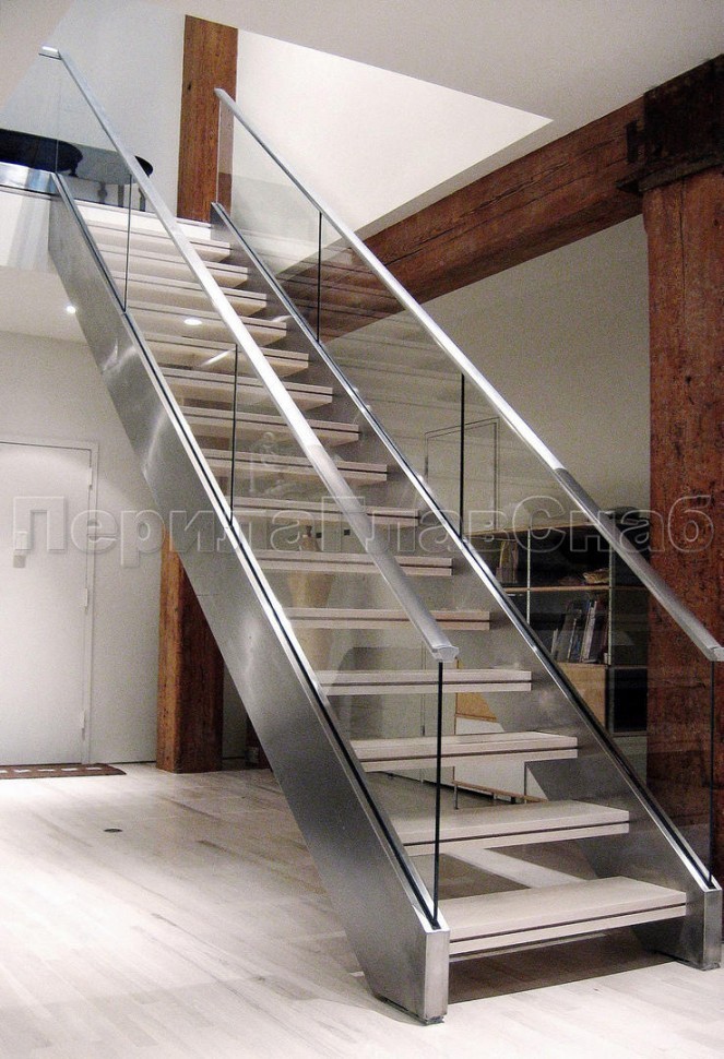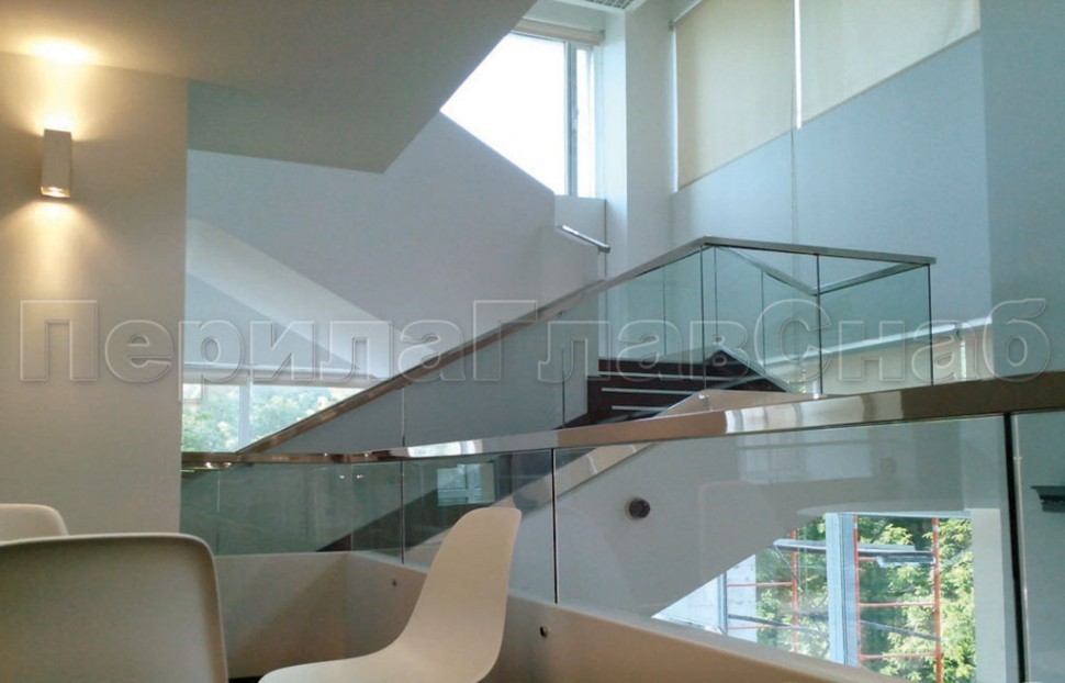 Ограждение с профильным поручнем с пазом на точечном креплении на лестнице