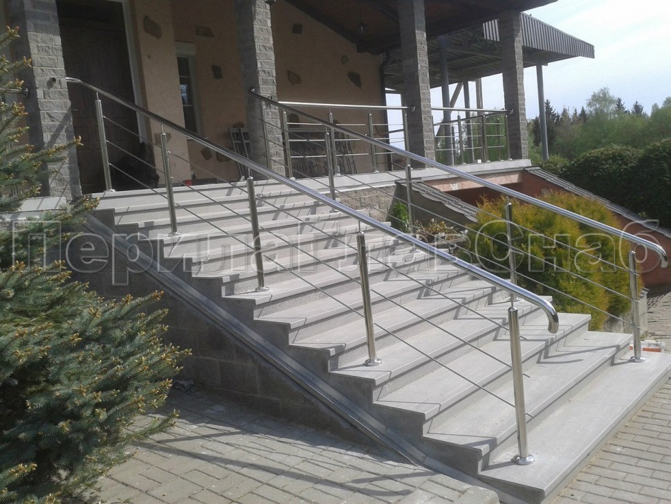 Ограждения из нержавейки. Заполнение из тросиков (нестандартная конфигурация) для крыльца
