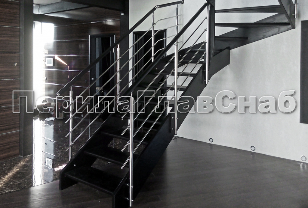 Четыре ригеля на сварке, квадратный деревянный поручень и круглые стойки в Новосибирске. Готовые проекты ПерилаГлавСнаб - фото 1