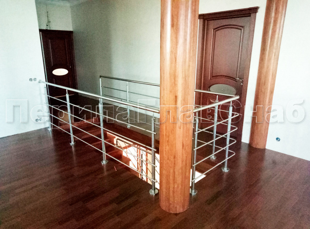 Четыре ригеля на держателях, квадратный деревянный поручень и круглые стойки в Новосибирске. Готовые проекты ПерилаГлавСнаб - фото 1