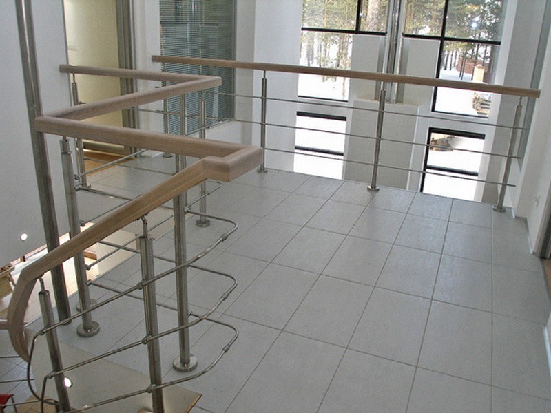 Нержавеющие ограждения без ригелей с круглым деревянным поручнем и стойками с деревянными вставками