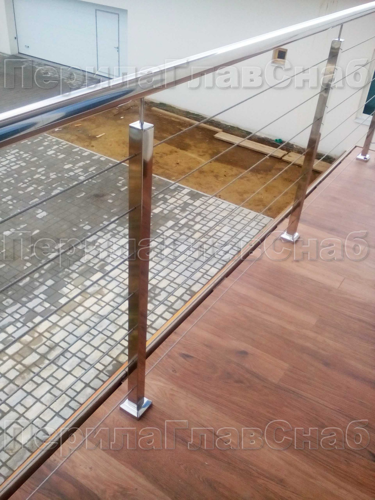 Ограждения из нержавейки. Заполнение из 2х тросиков. Квадратные стойки