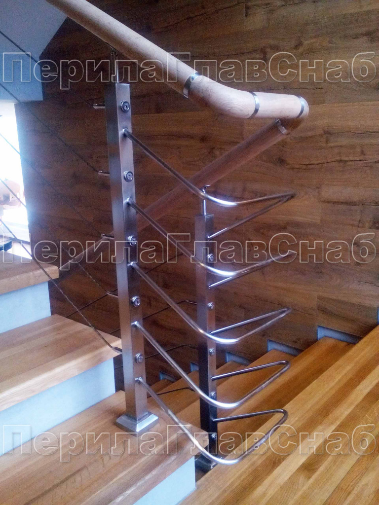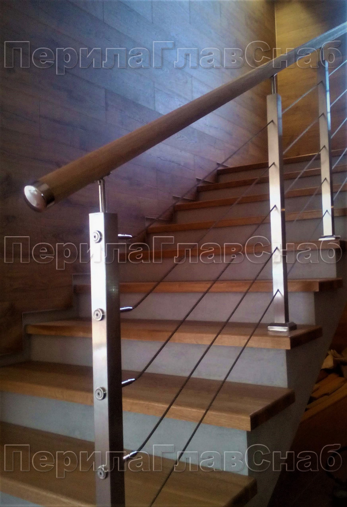 Четыре ригеля на держателях, квадратный деревянный поручень и квадратные стойки