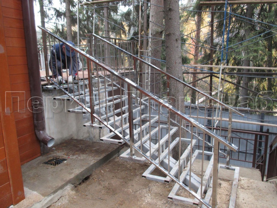 Четыре ригеля на сварке, круглый поручень и круглые стойки для крыльца