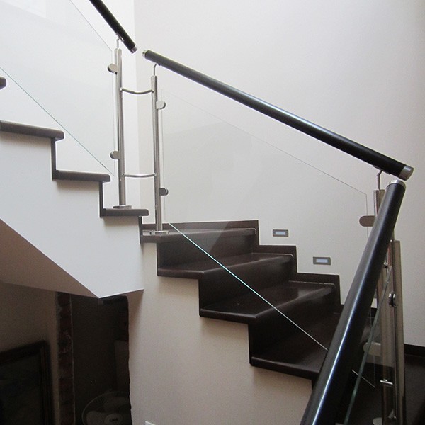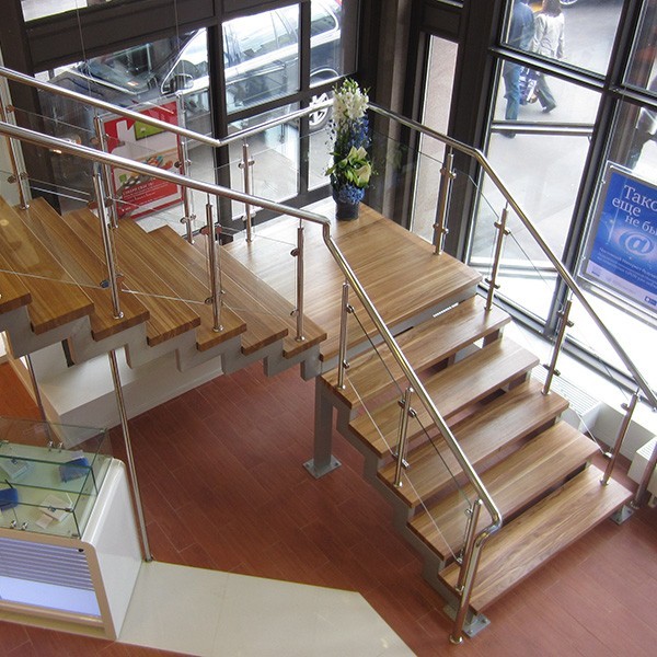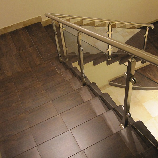 Мы готовы изготовить классическое ограждение лестниц из стекла и нержавеющей стали маршевого типа. Данная конструкция может быть монолитной (например, бетонной), или выполненной на косоурах или больцах. Лестничное ограждение маршевого типа из нержавеющей стали и стекла строится на основе маршей с разным углом наклона. Для облегчения подъема по данной конструкции создаются специальные поворотные плоские площадки, которые могут соединяться забежными ступенями.