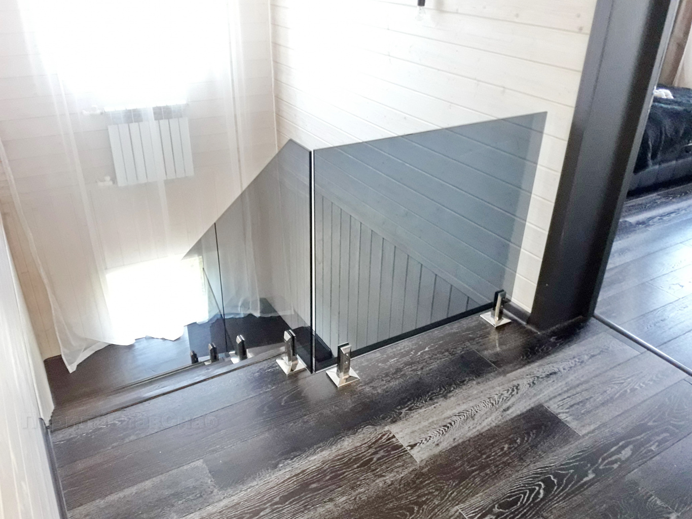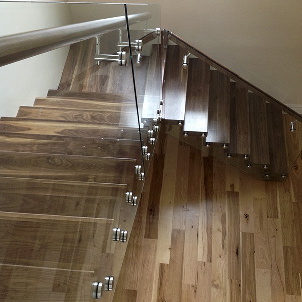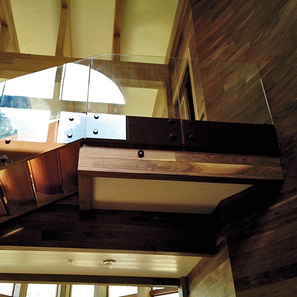 Несущее стекло на алюминиевом профиле с креплением в торец. Профиль скрыт декоративной накладкой под дерево. Очень красивое решение. Под домашний стиль.