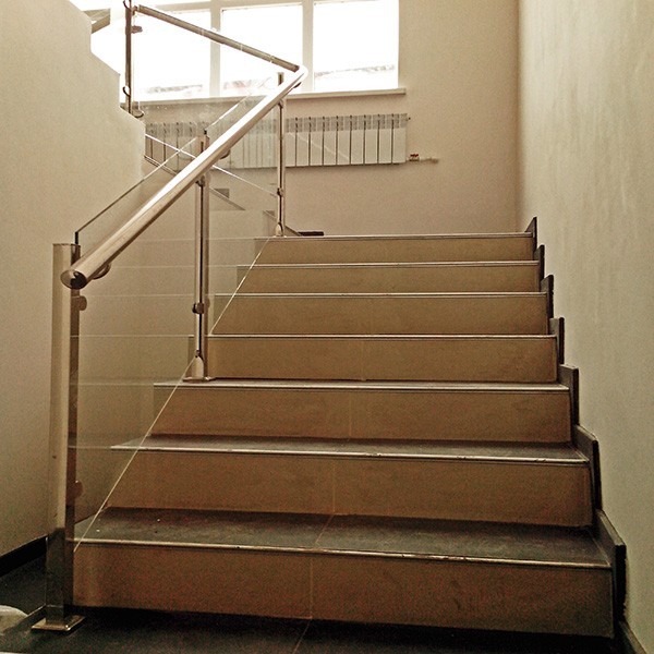 Лестница на косоуре с внутреннего двора комплекса к жилому гостиничному блоку. Несущая конструкция ограждений на нержавеющей стали марки AISI304L. В качестве экрана каленое стекло 8 мм, ультрапрозрачное, закрепленное на зажимных стеклодержателях. Недорогой вид стеклянных ограждений для лестницы.