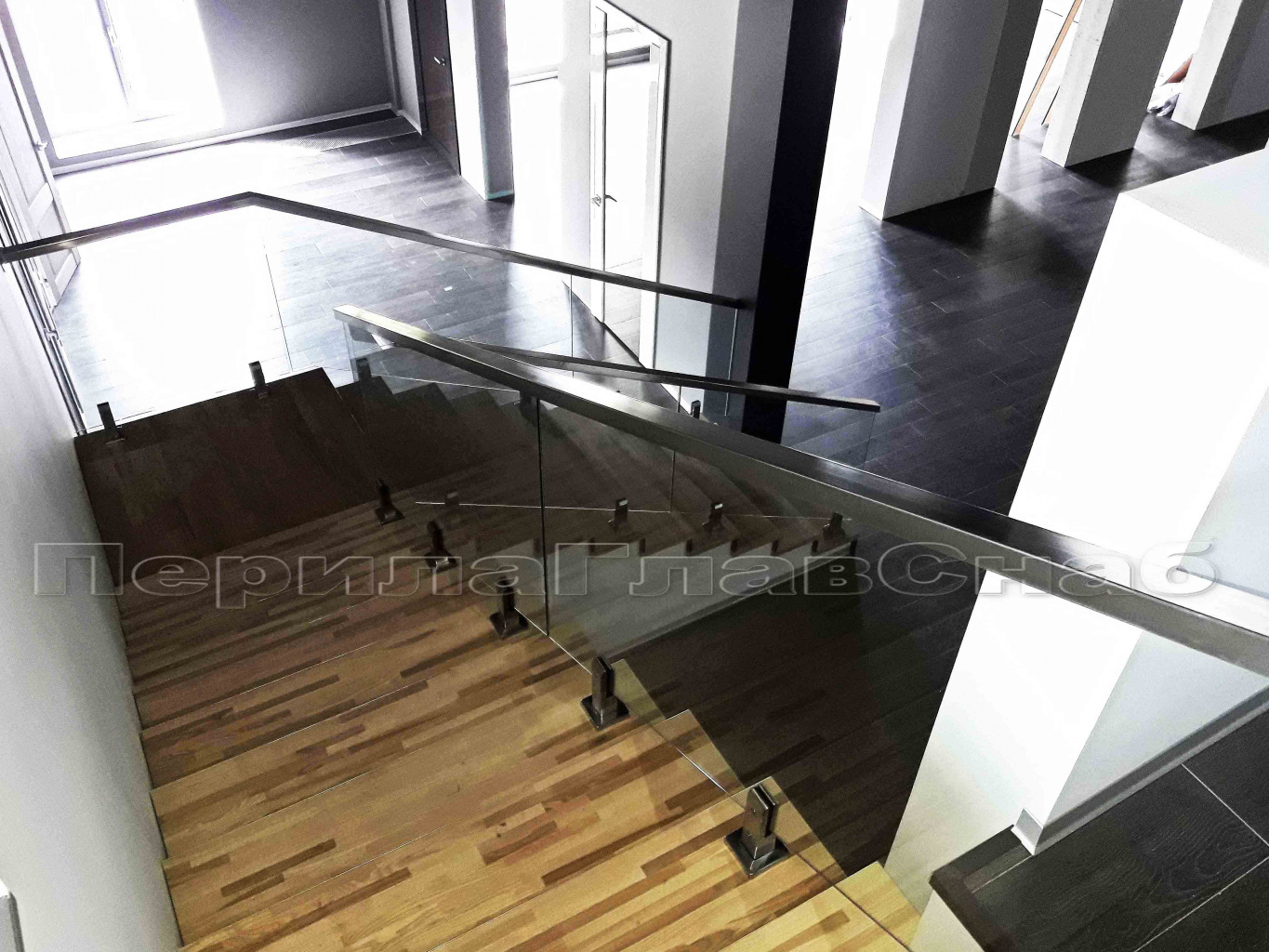Ограждение лестницы с квадратными стойками и пластинчатыми стеклодержателями в Новосибирске. Готовые проекты ПерилаГлавСнаб - фото 1 Ограждение лестницы с квадратными стойками и пластинчатыми стеклодержателями в Новосибирске. Готовые проекты ПерилаГлавСнаб - фото 2