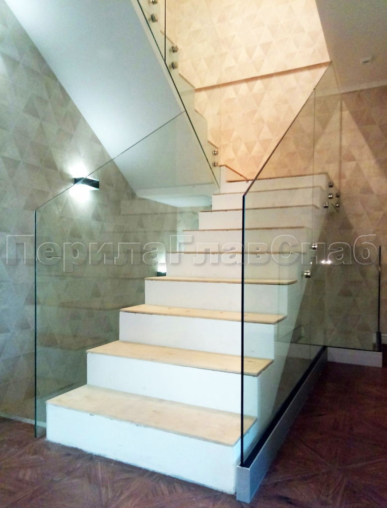 Наиболее популярные решения цельностеклянных ограждений лестничных маршей: