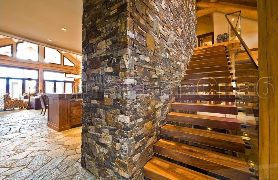 Ограждение с деревянным поручнем на точечном креплении на лестнице