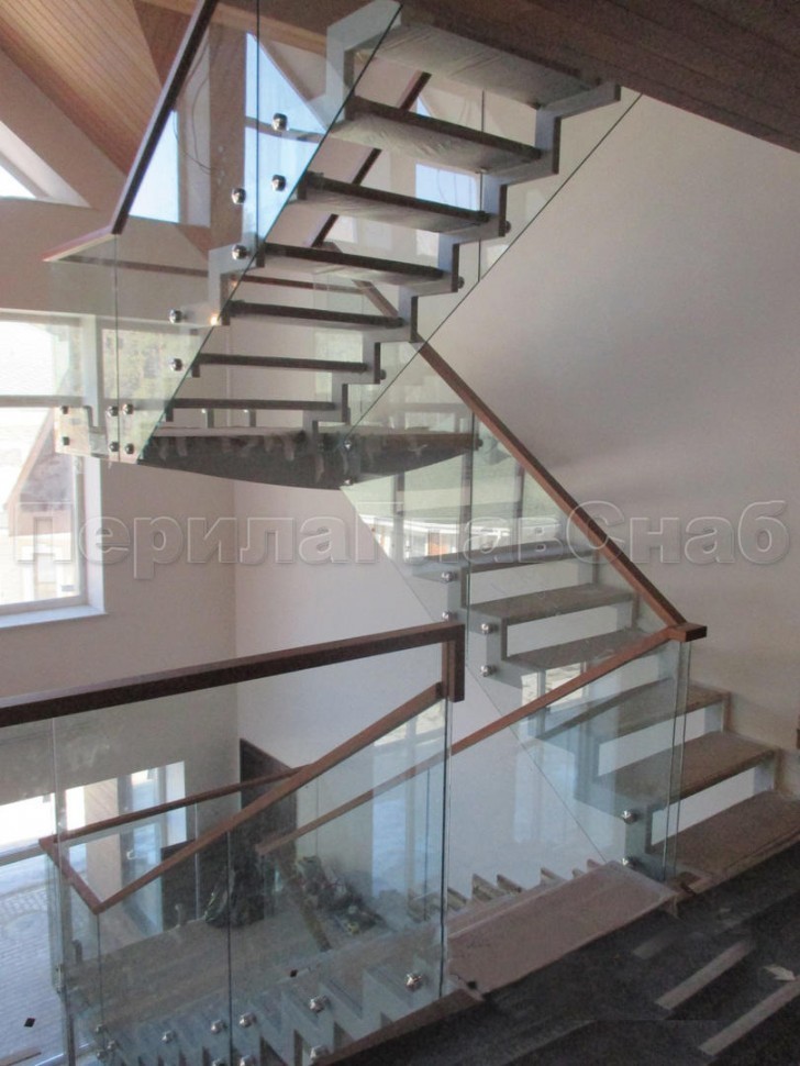 Ограждение с деревянным поручнем на выносе на точечном креплении на лестнице