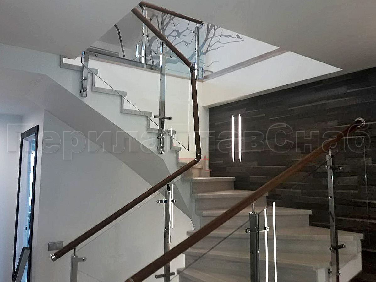 Ограждение лестницы с квадратными стойками и пластинчатыми стеклодержателями в Новосибирске. Готовые проекты ПерилаГлавСнаб - фото 1 Ограждение лестницы с квадратными стойками и пластинчатыми стеклодержателями в Новосибирске. Готовые проекты ПерилаГлавСнаб - фото 2