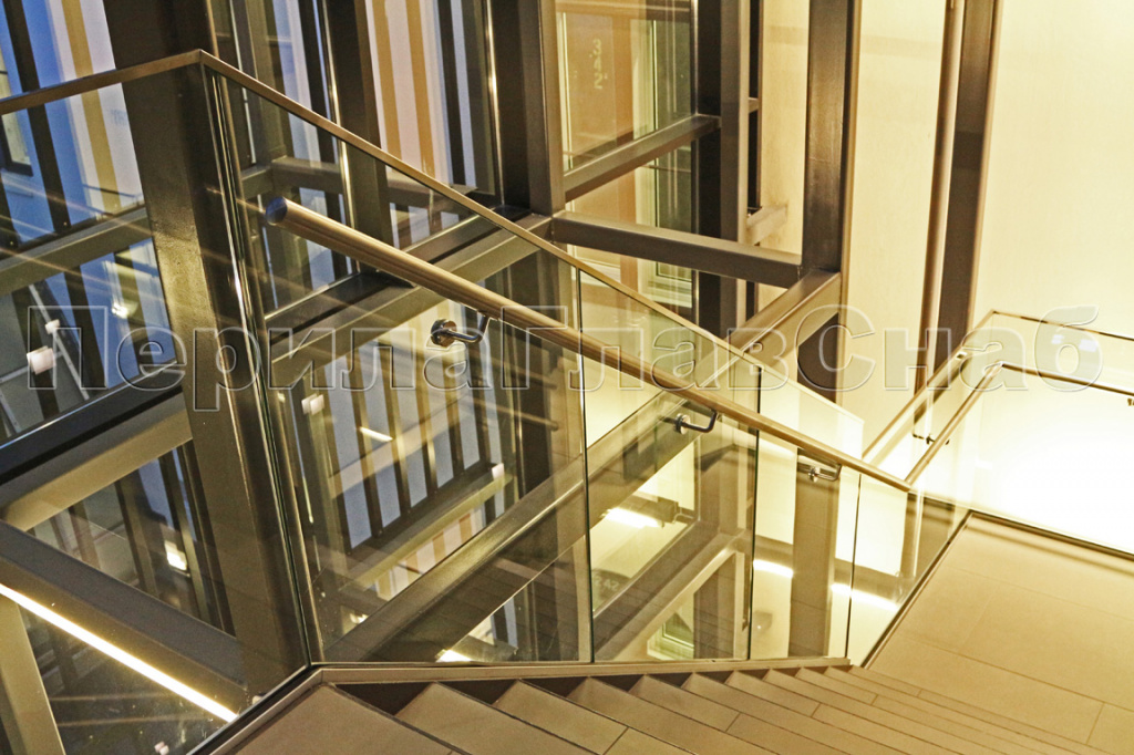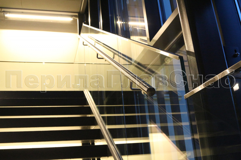 Ограждения лестниц на несущем стекле с подсветкой в Новосибирске. Готовые проекты ПерилаГлавСнаб
