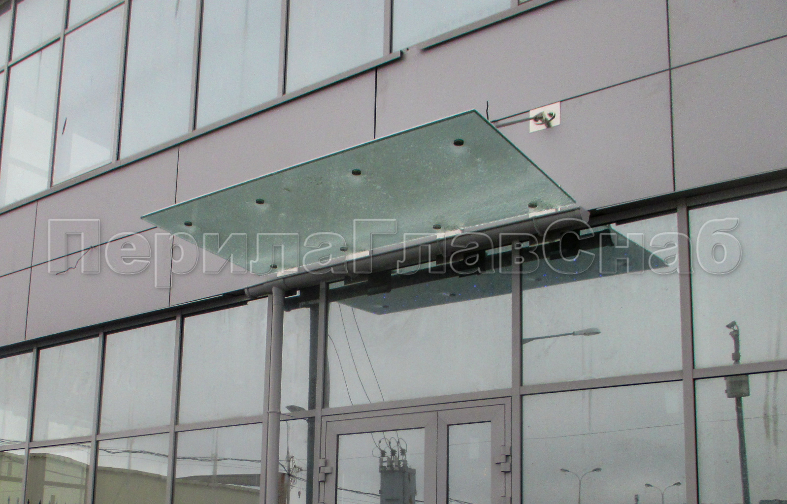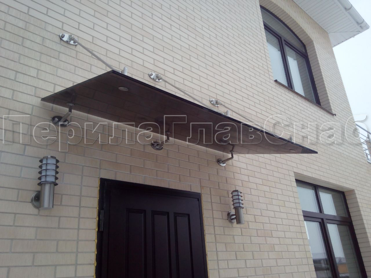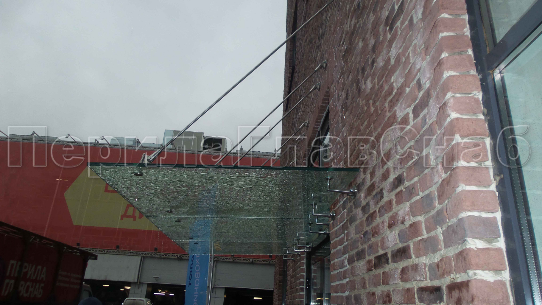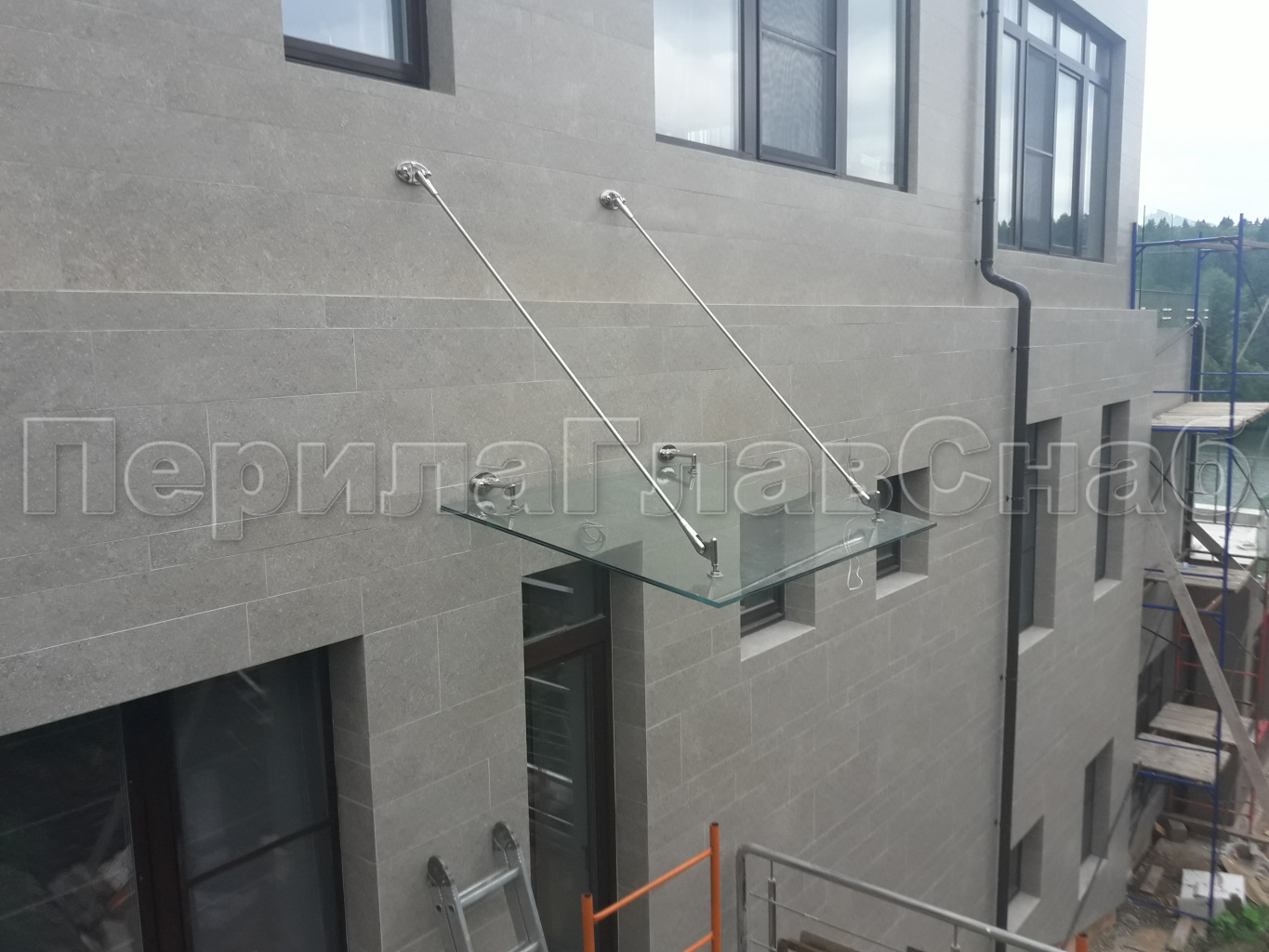 Стеклянный козырек на вантах и профильном каркасе
